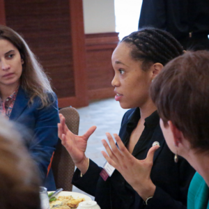 Woman Speaking with Table